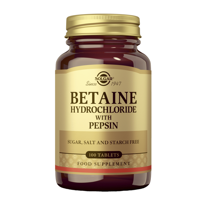 Solgar® Betaiinihydrokloridi + pepsiini -suolahappo tukee vähähappoisen vatsan hyvinvointia. Tuote sisältää suolahappoa sekä proteiinia hajoittavaa pepsiinientsyymiä.