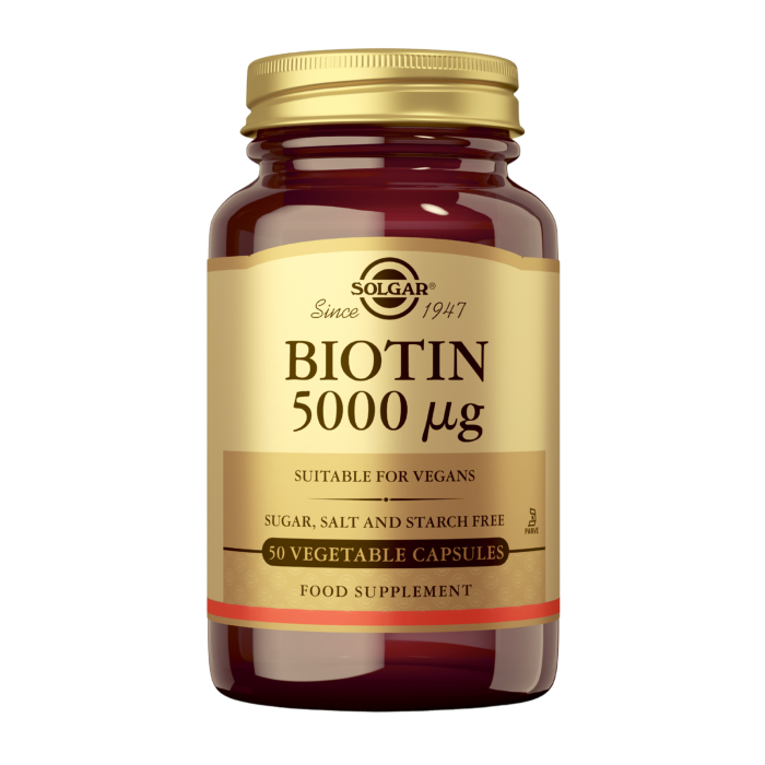 Erittäin vahva Solgar Biotiini 5000 μg tukee elimistön biotiinin saantia ja tasoja tehokkaasti.