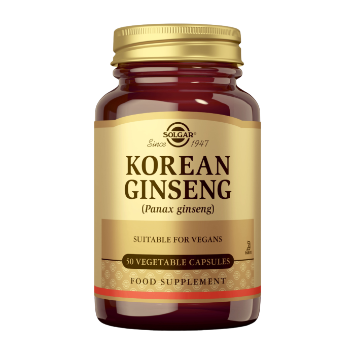 Solgar® Korean Ginseng (Panax ginseng) sisältää korealaista alkuperää olevaa ginsengjuurijauhetta ja -uutetta.