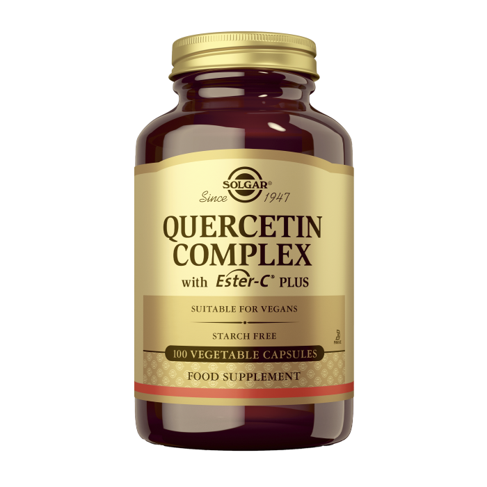Solgar® Kversetiini Complex sisältää bioflavonoidi kversetiiniä, vatsaystävällistä Ester C® -vitamiinia, bromelaiinia, acerolaa, ruusunmarjaa, sitrusbioflavonoideja ja rutiinia.