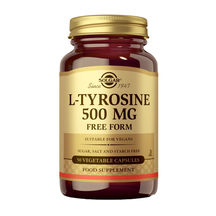Solgar® L-Tyrosiini 500 mg sisältää tyrosiinia, joka on kehossa luontaisesti esiintyvä vapaa aminohappo.