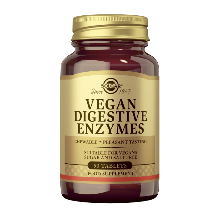 Vegaaninen ruuansulatusentsyymi Solgar® Vegan Digestive Enzymes on pureskeltava, miellyttävän makuinen ruuansulatusentsyymivalmiste kasvissyöjille ja vegaaneille. Tuote auttaa pilkkomaan ravinnon proteiineja, hiilihydraatteja ja rasvoja.