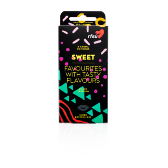 Sweet on lajitelma suosituimpia kondomeja erilaisilla tuoksu- ja makuaromeilla sinulle, joka haluat stimuloida useampia aisteja ja kokeilla jotakin uutta. Tutustu eri muotoihin, ominaisuuksiin, ja aromeihin. Paketissa on 1 kpl Magic Juicy Grape, 1 kpl Magic Banana Split, 1kpl Thin Piña Colada, 1 kpl Thin Raspberry, 1 kpl Näkken Honey Mel0n, 1 kpl Näkken Cola, 1kpl Regular Strawberry ja 1 kpl Regular Vanilla. Lajitelma muotoiltuja, suoria, sileitä ja juomutettuja lateksikondomeja säiliöllä ja eri aromiliukasteilla.