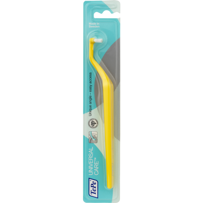 TePe Universal Care™ - harjan ainutlaatuisesti muotoiltu kaulaosa mahdollistaa optimaalisen ulottuvuuden implanttien posken- ja kielenpuolisten pintojen puhdistamiseen. Pieni, pitkäharjaksinen harjaspää mahdollistaa implanttirakenteen alapuolen puhdistamisen. Soveltuu myös kallistuneiden hampaiden, kielenpuolisten oikomiskojeiden ja muiden vaikeasti puhdistettavien pintojen puhdistamiseen, implanttien palatinaali- ja linguaalipinnat.