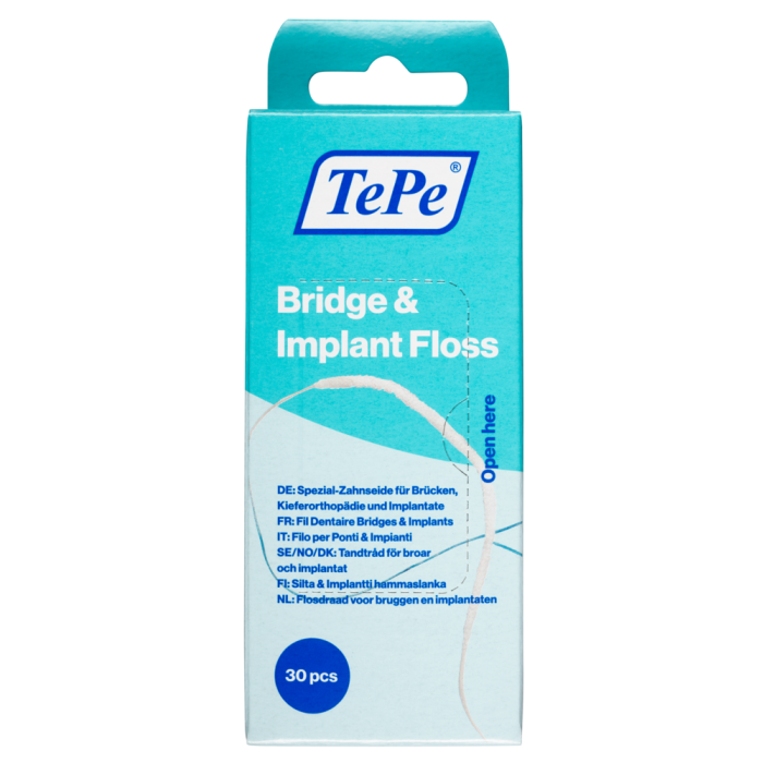 TePe® Bridge & Implant Floss on paksu, joustava hammaslanka, joka on suunniteltu erityisesti hammasimplanttien, siltojen, oikomiskojeiden ja leveiden hammasvälien puhdistukseen. Hammaslangassa on jäykät päät, jotka helpottavat hammaslangan asettamista hammasväliin. Joustava hammaslanka liukuu helposti implanttien, siltojen ja rautojen ympärillä ja poistaa ruoantähteet ja plakin. Pakkaus sisältää 30 hammaslankaa ja sitä suositellaan vain yhden henkilön käyttöön. Kertakäyttöinen.