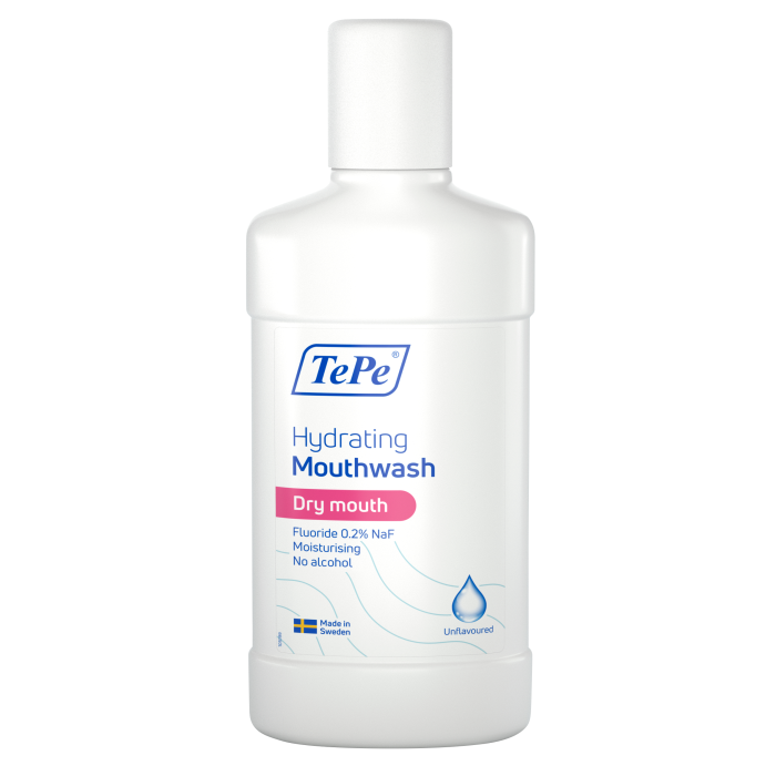 TePe Kosteuttava Suuvesi Maustamaton auttaa lievittämään suun kuivumisen oireita.
