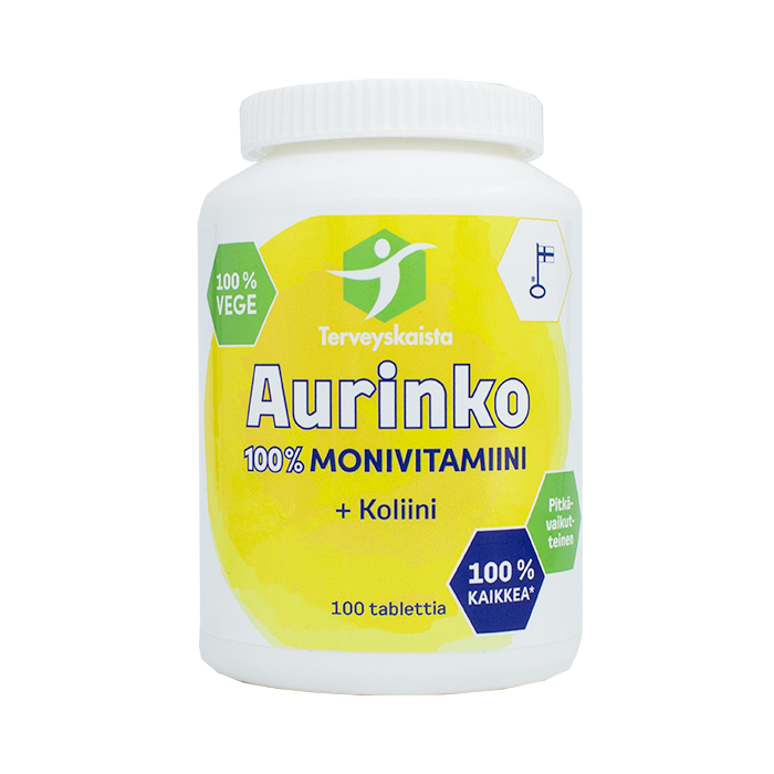 Aurinko100% Monivitamiini on kotimainen, vegaaninen ja pitkävaikutteinen ravintolisä, joka sisältää 100 % päivittäisestä saantisuosituksesta kaikkia kehon tarvitsemia vitamiineja ja kivennäisaineita – yhdessä tabletissa. Pitkävaikutteinen koostumus varmistaa, että ravintoaineet imeytyvät elimistöön tasaisesti koko päivän ajan, jolloin niiden hyödyt ovat maksimaaliset. Erinomainen valinta tukemaan vastustuskykyä, jaksamista, muistia ja ihon hyvinvointia.