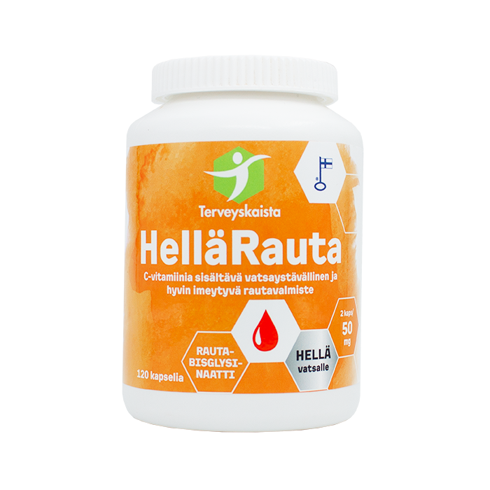 HelläRauta on vatsaystävällinen rautavalmiste, koska se perustuu ferrobisglysinaattiin, joka on yksi parhaiten siedetyistä raudan muodoista. Lisäksi valmisteessa on natriumaskorbaatti C-vitamiinia, joka lisää raudan imeytymistä elimistössä. Lopputuloksena on tasapainoinen ja miellyttävä rautavalmiste arkeen.