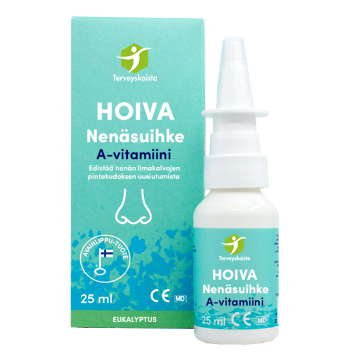 A-vitamiinia sisältävä nenäsuihke kuiville limakalvoille ja tukihoidoksi nenän sairauksien yhteydessä. HOIVA A-vitamiini Nenäsuihke voitelee ja kosteuttaa sekä edistää limakalvoepiteelin uusiutumista. Nenäsuihke sopii erityisolosuhteiden, nenän sairauksien mm. lääkeperäisen, allergisen nuhan tai hajunenän aiheuttamaan nenän limakalvon kuivuuteen ja surkastumiseen. Nenäsumutteen A-vitamiini edistää nenän limakalvon uusiutumista. Sopii aikuisille ja yli 2-vuotiaille lapsille. Kehitetty ja valmistettu Suomessa. CE-merkitty lääkinnällinen laite.