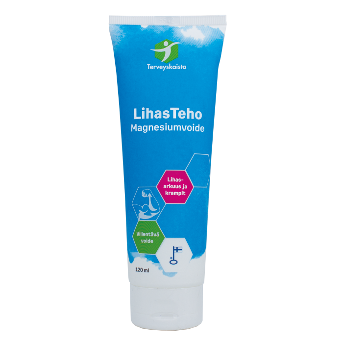 LihasTeho magnesiumvoide on viilentävä voide lihaskramppien ja lihasarkuuden paikalliseen lievittämiseen. Voide imeytyy helposti ja jättää ihon miellyttävän tuntuiseksi. Ainesosina ovat magnesium, MSM ja mentholi. Käyttö: Hiero 10–15 cm voidetta hoidettavalle alueelle 2–3 kertaa päivässä tai tarvittaessa. Varoitukset: Vältä aineen joutumista silmiin, limakalvoille ja haavoihin. Ei suositella raskauden tai imetyksen aikana. Ei alle 2-vuotiaille lapsille. Käänny lääkärin puoleen, ellei olosi parane 7 päivän jälkeen tai se huononee. Ei lasten ulottuville eikä näkyville. Vain ulkoiseen käyttöön.