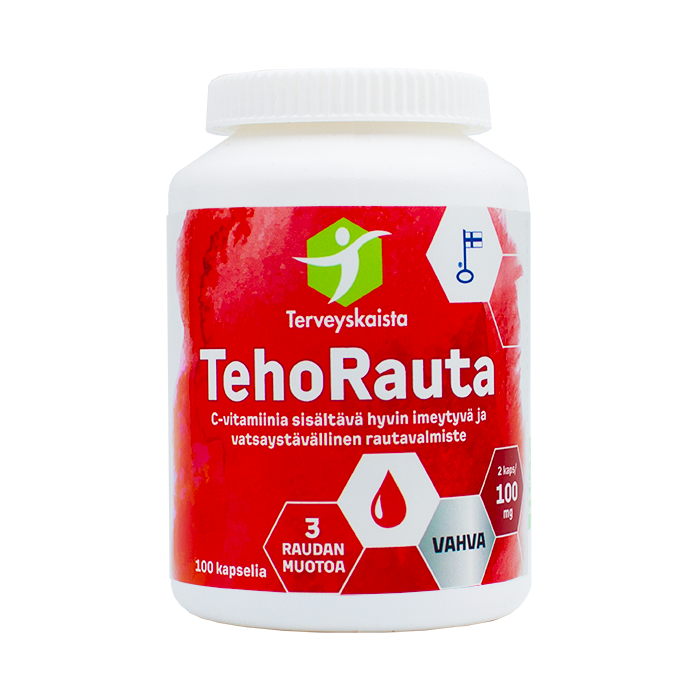 TehoRauta 100 mg 100 kaps sisältää kolmea eri raudan muotoa – ferrobisglysinaattia, ferrofumaraattia ja ferroglukonaattia – jotka täydentävät toisiaan. Lisäksi mukana on C-vitamiinia joka edistää raudan imeytymistä elimistössä. Tuotteen happoneutraali C-vitamiinimuoto natriumaskorbaatti sopii herkkävatsaisille.