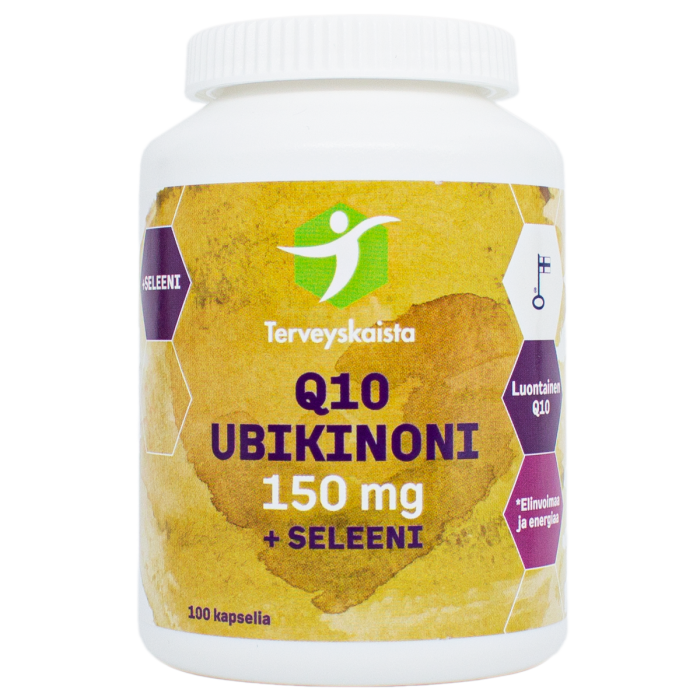 Ubikinoni 150 mg + seleeni + C-vitamiini auttaa vähentämään väsymystä ja uupumusta sekä edistää normaalia energia-aineenvaihduntaa.