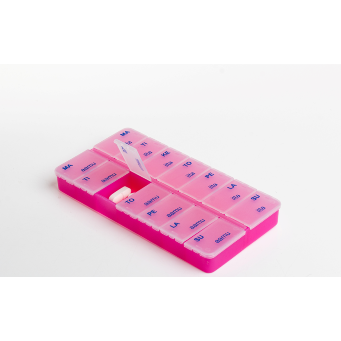 Käytännöllinen ja tilava aamu-iltadosetti, paljon pirteitä värivaihtoehtoja. Lääkkeille, vitamiineille ja ravintolisille. Kansiosa irrotettavissa. Helppokäyttöinen ja suosittu dosetti.