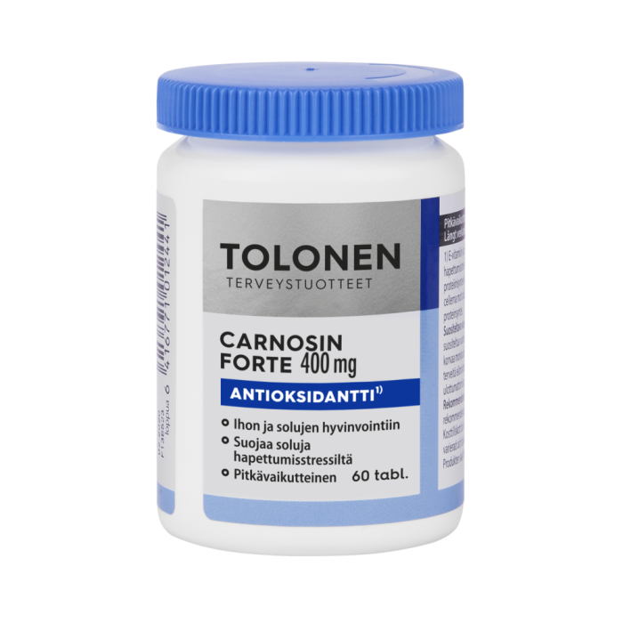 Tolonen Carnosin Forte 400 mg -tableteista karnosiini vapautuu hitaasti, vasta ohutsuolessa, jossa se imeytyy. Valmiste sisältää karnosiinin lisäksi E-vitamiinia ja sinkkiä. E-vitamiini edistää solujen suojaamista hapettumisstressiltä. Sinkki edistäää normaalia proteiinisynteesiä.