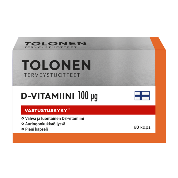 Tolonen-valmisteessa luontainen, lampaanvillarasvasta eli lanoliinista eristetty D3-vitamiini on auringonkukkaöljyssä - rasvaliukoisena vitamiinina D-vitamiini imeytyy näin erinomaisesti. D-vitamiini edistää luiden pysymistä normaalina ja normaalin lihastoiminnan ylläpitämistä sekä immuunijärjestelmän normaalia toimintaa. Pienikokoinen kapseli on helppo niellä.