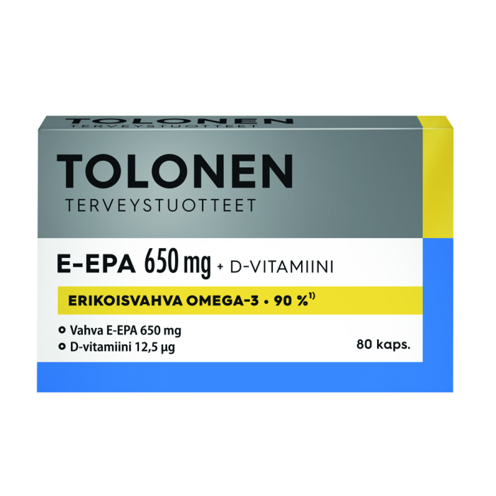 Tolonen E-EPA 650 mg sisältää E-EPA:a vahvassa muodossa. Yhdessä kapselissa on 665 mg omega-3-rasvahappoja joista peräti 650 mg E-EPA:a. Siksi vain 1-2 kapselia päivässä riittää. Tuotteessa käytetty erittäin puhdas kalaöljytiiviste valmistetaan tyhjiötislaamalla, jolloin myös mahdolliset ympäristömyrkyt saadaan poistettua.