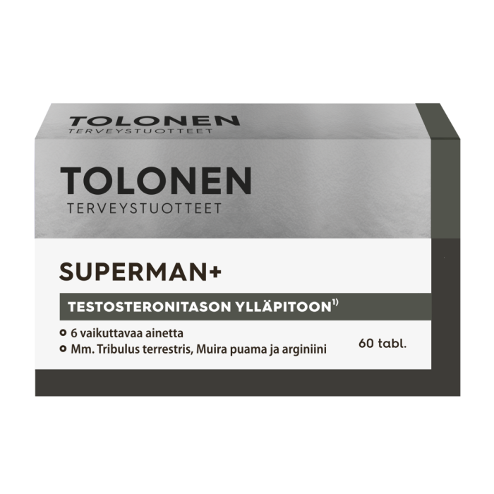 Tolonen Superman sisältää harkitun yhdistelmän miehiselle kunnolle tarkoitettuja ainesosia, kuten Tribulus terrestris- ja Muira Puama -uutteita, L-arginiinia ja guaranaa sekä sinkkiä ja seleeniä. Sinkki edistää normaalia hedelmällisyyttä ja lisääntymistä sekä veren testosteronitasojen pysymistä normaalina. Seleeni edistää normaalia siittiöiden muodostusta.