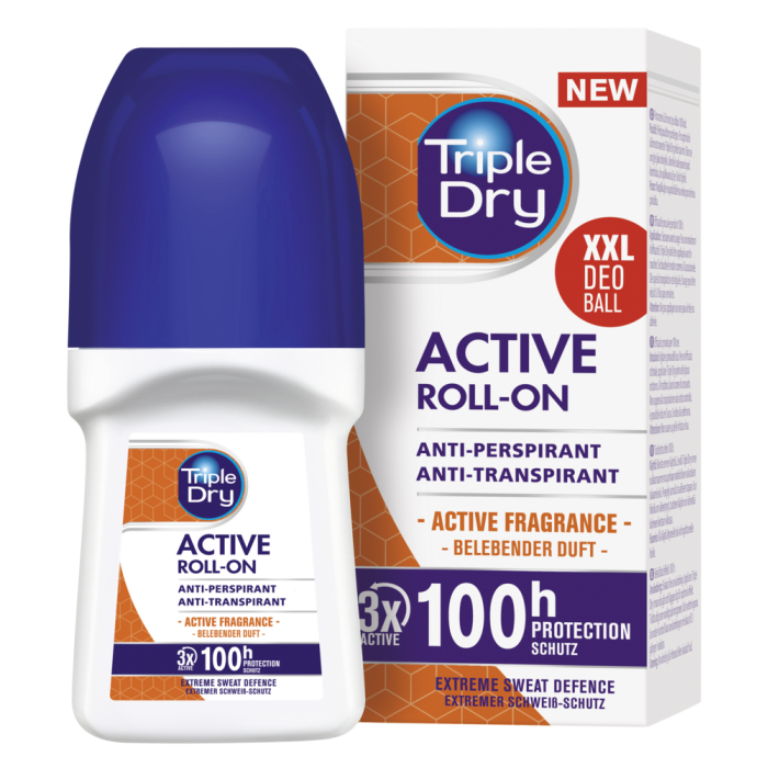 Triple Dry Active Men 100h antibakteerinen antiperspirantti roll-on estää tehokkaasti liiallista hikoilua. Sen kliinisesti todistettu kolmivaiheinen suojauskompleksi ja aktiivinen koostumus tarjoavat maksimaalisen tehon ja pitkäkestoisen vaikutuksen jopa 100 tunnin suojan hikoilua ja hajuja vastaan, mukautuen kehon tarpeisiin ja lämpötilaan. Sopii normaaliin tai voimakkaaseen hikoiluun kaikille, jotka tarvitsevat pitkäkestoista suojaa hikoilua vastaan. Hoitavana aineena tuotteessa kosteuttavaa glyseriiniä ja ihoa rauhoittavaa allantoiinia. Käytännöllinen, suuri rollonpallon muotoilu nopeaan ja mukavaan levitykseen. Miellyttävän hienovarainen tuoksu takaa pitkäkestoisen aktiivisuuden tunteen. Ei sisällä alkoholia.