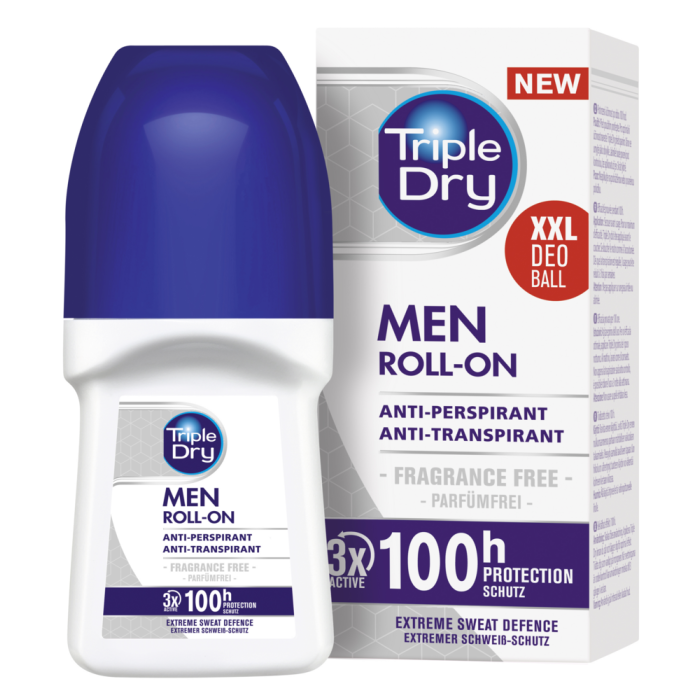 Triple Dry Men100h antibakteerinen antiperspirantti roll-on estää tehokkaasti liiallista hikoilua. Sen kliinisesti todistettu kolmivaiheinen suojauskompleksi ja aktiivinen koostumus tarjoavat maksimaalisen tehon ja pitkäkestoisen vaikutuksen jopa 100 tunnin suojan hikoilua ja hajuja vastaan, mukautuen kehon tarpeisiin ja lämpötilaan. Hoitavana aineena tuotteessa kosteuttavaa glyseriiniä ja ihoa rauhoittavaa allantoiinia. Käytännöllinen, suuri rollonpallon muotoilu nopeaan ja mukavaan levitykseen. Sopii normaaliin tai voimakkaaseen hikoiluun kaikille, jotka tarvitsevat pitkäkestoista suojaa hikoilua vastaan. Sopii myös herkkäihoisille ja hajusteallergisille. Hajusteeton. Ei sisällä alkoholia.