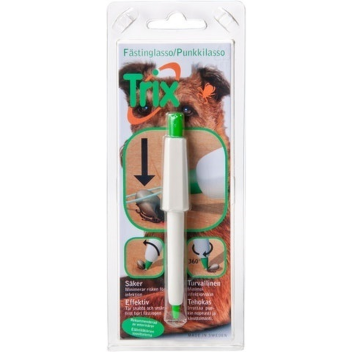 TRIX Punkkilasso on varma, nopea ja kivuton tapa poistaa punkit. Trix Punkkilasso toimii punkin ympärille kiristettävän silmukan periaatteella. Se on erittäin nopea käyttää ja siksi helppokäyttöinen lemmikkien kanssa. Ainutlaatuisen rakenteen ansiosta koko punkki voidaan poistaa kerralla, jolloin tulehduksen riski on pienempi. Pehmeä silmukka ei vahingoita punkkia, mikä on tärkeää tulehdusten välttämiseksi. Punkinpoistaja tarttuu automaattisesti punkkiin oikealla tavalla, nipistämättä tai murskaamatta punkkia.
