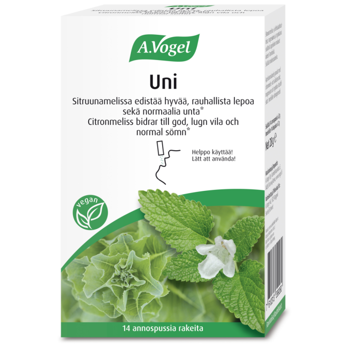 Uni rakeet – ja heräät virkeänä aamuun •Auttaa ylläpitämään normaalia unta* •Edistää rauhallista ja levollista unta* •Helppokäyttöiset rakeet liukenevat suussa nopeasti •Uniikki yhdistelmä sitruunamelissa- ja lehtisalaattiuutetta, magnesiumia ja L-tryptofaania •Sopii yli 12-vuotiaille •Ei aiheuta riippuvuutta A.Vogelin uusi tuote sisältää ainutlaatuisen koostumuksen levolliseen uneen. Se sisältää lehtisalaattia, sitruunamelissaa, L-tryptofaania ja magnesiumia. Appelsiinin makuiset rakeet on helppo käyttää kaatamalla annospussillinen suoraan suuhun. Sitruunamelissa* (Melissa officinalis) Auttaa rentoutumaan, edistää hyvää ja rauhallista lepoa, edistää normaalia unta, auttaa ylläpitämään positiivista olotilaa Magnesium Auttaa vähentämään väsymystä ja uupumusta, edistää hermoston normaalia toimintaa, edistää normaaleja psykologisia toimintoja Sisältää 14 annospussia à 2 g, Net 28 g Ravintolisä