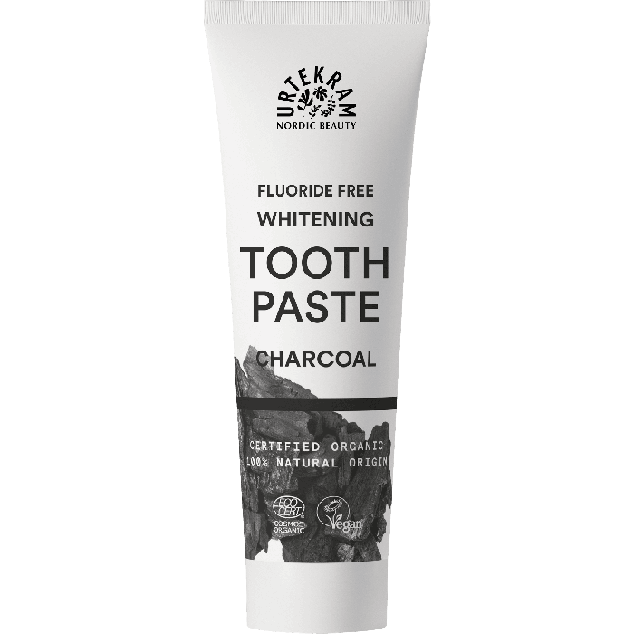 Urtekram Charcoal -hammastahna on fluoriton valkaiseva hammastahna, joka sisältää luontaista hiiltä. Luonnollinen pajuhiili ja sinkkilaktaatti auttavat vähentämään plakkia ja pahanhajuista hengitystä. Koska hammastahna on fluoriton, suosittelemme lisäämään fluoria sisältävän tuotteen päivittäiseen käyttöön. Luomusertifioitu Ecocert Cosmos Organic -standardin mukaisesti, Ecocert Greenlife, vegaaninen, 100 % biohajoava ja 100 % luonnollista alkuperää oleva koostumus.
