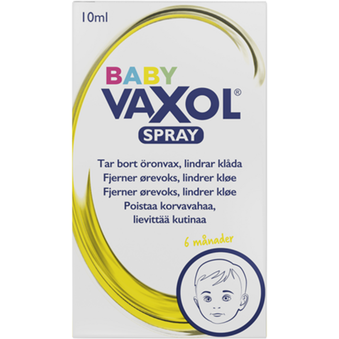 Vaxol Baby -suihkeessa on yksinkertainen ”Spray and Go” -annostelujärjestelmä, joka annostelee oikean annoksen öljyä korvakäytävään vähentäen sotkua. Patentoidun annostelijan ansiosta öljy aerolisoituu sumutteeksi ja levittyy korvakäytävän seinämiin. Hankalia vanutuppoja ei tarvitse laittaa, eikä odottaa siihen asti, että öljy täyttää korvakäytävän. Vaikuttava aine: farmaseuttisesti puhdistettu oliiviöljy. CE 2797 Lääkinnällinen laite. Valmistaja: HL Healthcare Ltd.