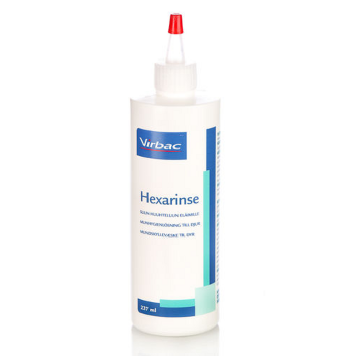Hexarinse on klooriheksidiiniglukonaattia sisältävä raikastava ja hyvänmakuinen suuvesi suun desinfiointiin. Klooriheksidiinin antimikrobiaalinen vaikutus voi auttaa ehkäisemään ja vähentämään ientulehdusta. Hexarinsen alkoholiton koostumus helpottaa ienärsytystä ja raikastaa lemmikkisi hengityksen.