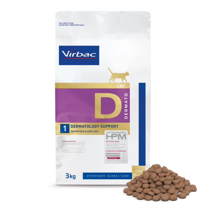 Virbac HPM Cat Dermatology Support D täysruoka on erikoisruokavalio kissalle ihon toiminnan tukemiseen ihosairauksien ja liiallisen karvanlähdön sekä kutinan ja hilseilyn yhteydessä.