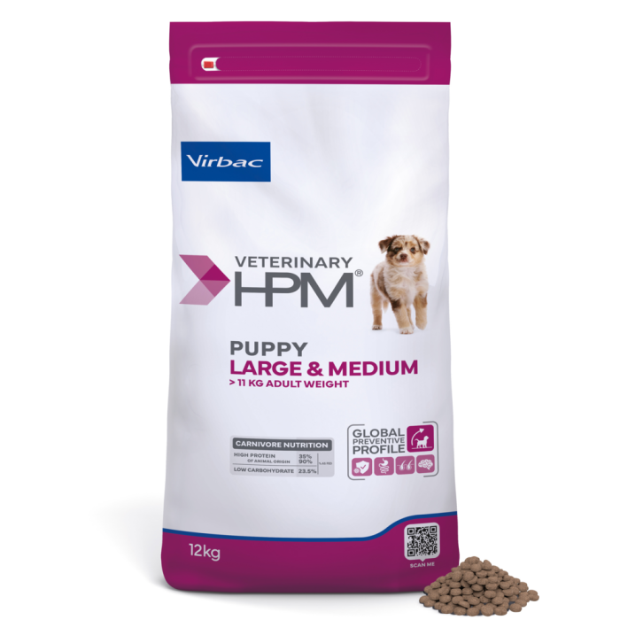 Virbac HPM Dog Puppy Large & Medium täysruoka keskikokoisten rotujen pennuille (aikuispaino 11–25 kg) iältään 2–6 kuukautta, sekä suurikokoisten rotujen pennuille (aikuispaino yli 25 kg) iältään 2–7 kuukautta.