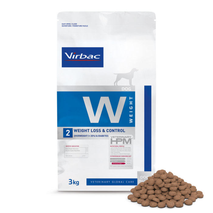 Virbac HPM Dog Weight Loss & Control W2 kuivaruoka on erikoisruokavalio koiralle ylipainon (<30 %) vähentämiseen sekä glukoosin saannin säätelyyn normaalipainoiselle diabetes mellitusta sairastavalle koiralle.