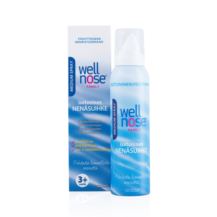 WellNose® FAMILY -isotoninen nenäsuihke, on valmistettu puhtaasta luonnollisesta merivedestä. Se kosteuttaa nenäonteloita ja auttaa pesemään ja poistamaan tehokkaasti limaa. WellNose® FAMILY:n asianmukainen käyttö yli 3-vuotiailla lapsilla ja aikuisilla päivittäisessä nenähygieniassa voi tuoda avun yleisiin oireisiin, kuten nenän kuivumiseen, ahtauttavaan nuhaan, poskiontelotulehdukseen, nenänielutulehdukseen tai kuivien limakalvojen aiheuttamaan äänen käheyteen. Sopii aikuisille ja yli 3-vuotiaille lapsille. Käyttövalmis pullo, medium spray. CE-merkitty lääkinnällinen laite.