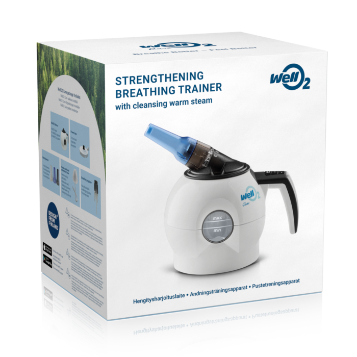WellO2 on kliinisesti tutkittu hengitysharjoituslaite, joka yhdistää sekä sisään- että uloshengityslihasten vastusharjoittelun ja lämpimän höyryhengittämisen. WellO2-harjoittelu tukee monipuolisesti hengitysterveyttä.