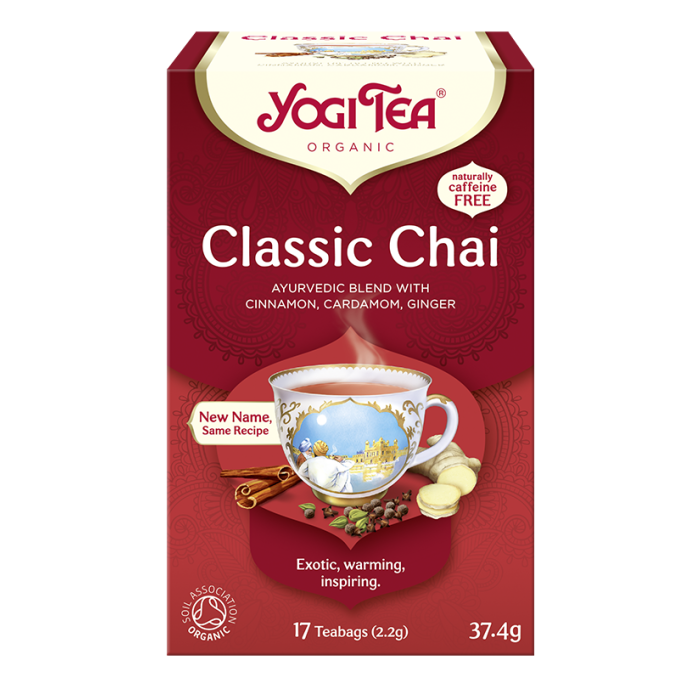 Yogi Tea® Classic Chai on klassikkomaku. Sisältää mm. kanelia, kardemummaa ja inkivääriä. Luontaisesti kofeiiniton.