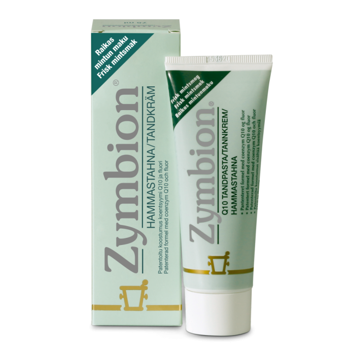Q10-hammastahna. Auttaa pitämään hampaat ja ikenet terveinä. Zymbionin patentoitu koostumus sisältää ubikinonia (koentsyymi Q10) ja fluoria. Zymbionin käyttö nostaa ikenien matalan Q10 ubikinonipitoisuuden terveiden ientaskujen tasolle. Sisältää fluoria, joka suojaa hampaita reikiintymiseltä.